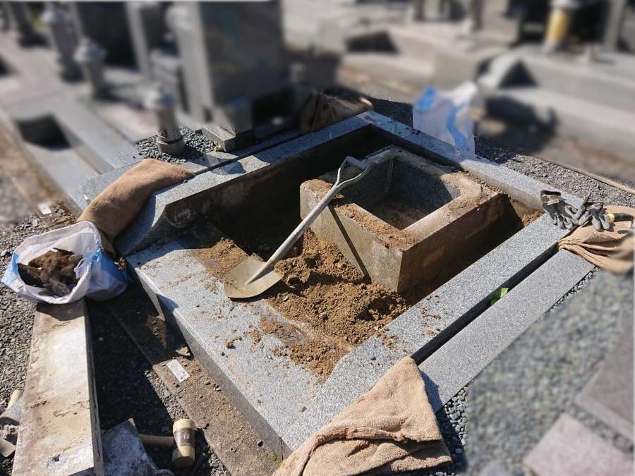 お墓本体をすべて取り外しました。京都市や宇治市では、納骨の形態はお骨壺であったり、さらしに包んだ状態であったり様々です。さらしで納骨されている場合は、お墓を完全に取り外してからご遺骨を取り出す方がきれいに取り出すことができます。